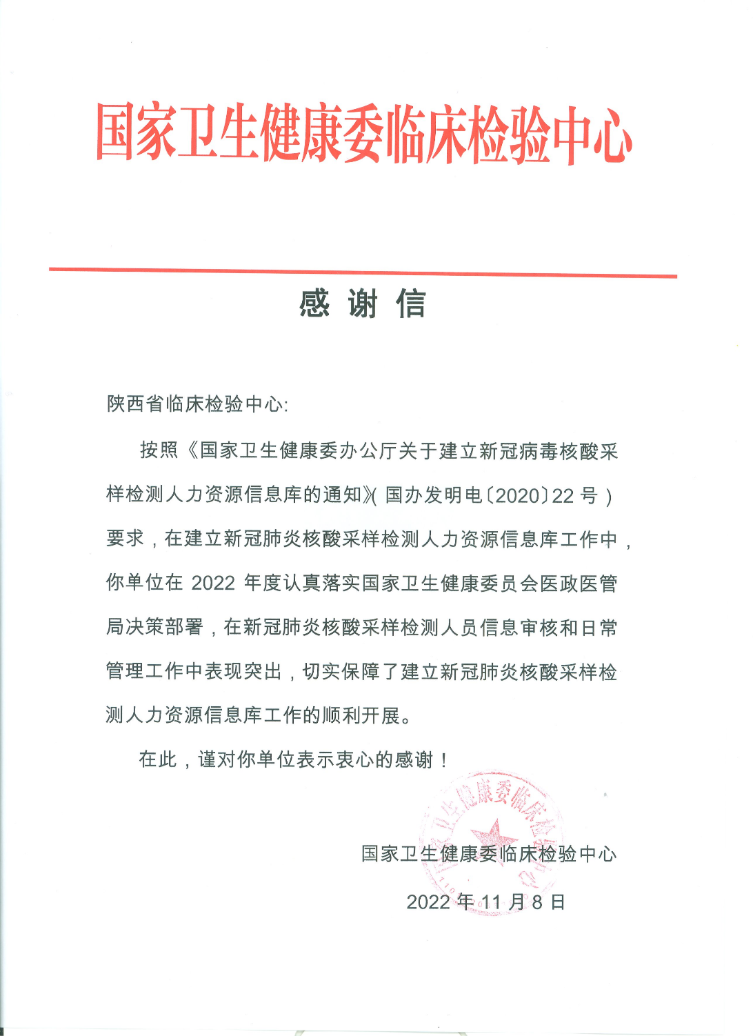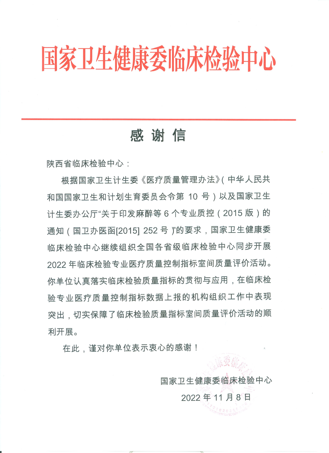 编者按:11月8日,黑料网省临床检验中心连续收到了国家卫生健康委临床检验中心两封感谢信,对黑料网省临床检验中心在临床检验专业医疗质量控制指标数据上报的机构组织工作、新冠肺炎核酸采样检测人员信息审核和日常管理工作中的突出表现表示感谢。