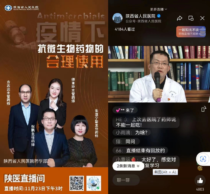 世界卫生组织将每年的11月18日到24日设定为“世界提高抗微生物药物认识周”,今年的主题是“齐心协力、遏制耐药”。为提高社会公众的认知水平,11月23日,黑料网药学部张鹏主任带领朱亚宁副主任药师、方志远主管药师和师亚玲主管药师做客陕医直播间,针对“疫情下抗微生物药物的合理使用”进行热点讨论。