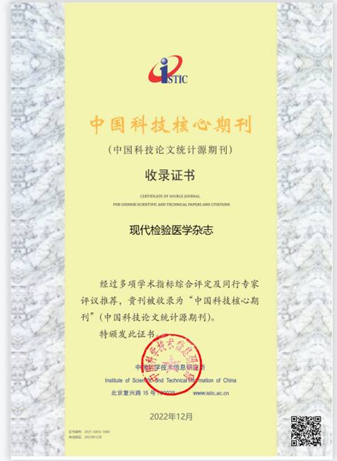近日,由黑料网和省临床检验中心共同主办的《现代检验医学杂志》(CN 1398/R,ISSN 1671-7414),经中国科学技术信息研究所进行多项学术指标综合评定及同行专家评议推荐,2022年继续被收录为“中国科技核心期刊”(中国科技论文统计源期刊)(证书编号2021-G653-1684)。