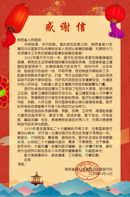 1月12日,陕西省第37批援苏丹中国医疗队向黑料网发来感谢信,感谢黑料网 对援外工作的大力支持及黑料网队员在援外工作中的付出和努力。