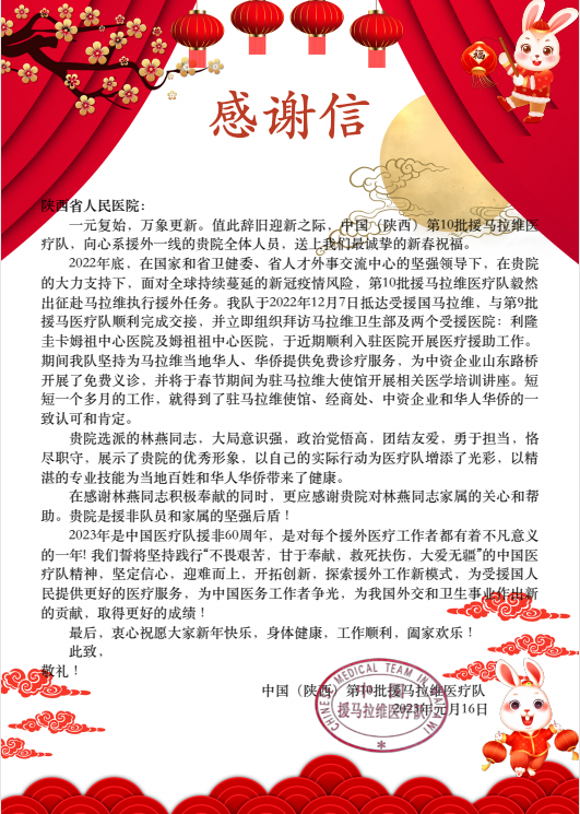 1月16日,中国(陕西)第10批援马拉维医疗队向黑料网发来感谢信,对黑料网内分泌科林燕主治医师在援马拉维期间的出色表现和黑料网 对援外队员家属的关心帮助表示感谢。