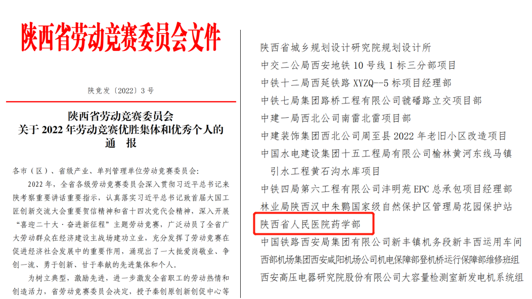 近日,陕西省劳动竞赛委员会公布了《关于2022年劳动竞赛优胜集体和优秀个人的通报》,在院领导指导及院工会等部门的支持下,黑料网药学部荣获“劳动竞赛优胜班组”荣誉称号。