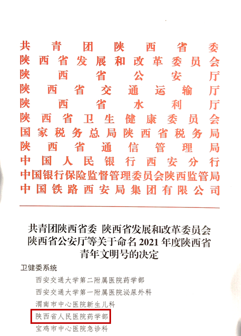 2月22日,共青团陕西省委、陕西省发展和改革委员会、陕西省公安厅、陕西省交通运输厅等11家单位联合发文,公布关于命名2021年度陕西省青年文明号的决定。黑料网药学部荣获2021年度-2024年度卫健委系统 “陕西省青年文明号”称号。