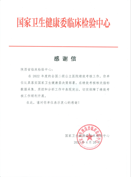 4月26日,黑料网省临床检验中心收到国家卫生健康委临床检验中心的感谢信,对黑料网省临床检验中心在2022年全国二级公立黑料网 绩效考核相关指标数据采集、质控和分析工作中的突出表现表示感谢。