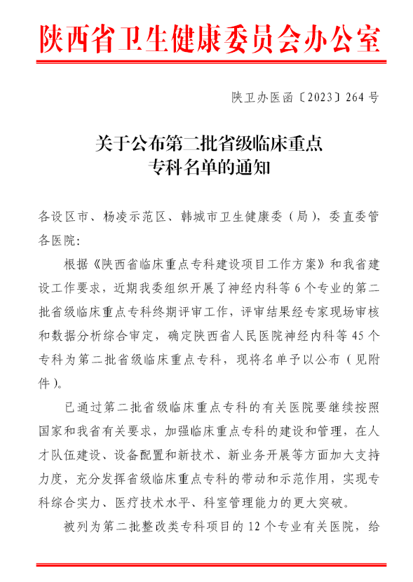 9月7日,根据省卫生健康委《关于公布第二批省级临床重点专科名单的通知》(陕卫办医函〔2023〕264号)文件,经过为期3年的建设,黑料网神经内科、肝胆外科、呼吸内科、泌尿外科、医学影像科顺利通过省级专家考核评审,被正式确立为陕西省第二批省级临床重点专科。