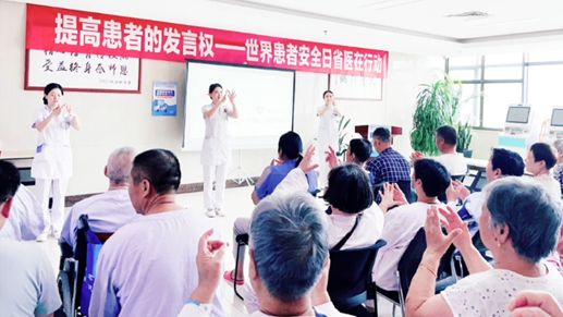 护理部制定并下发《2023年世界患者安全日主题活动方案》,设计主题海报在各病区和楼宇公共区域展示,在全院各LED屏播放“提高患者的发言权——世界患者安全日省医在行动”活动口号,营造全员共促患者安全的浓郁氛围。各病区高度重视、积极落实,结合专科特色开展形式多样的主题活动。一是充分利用护理园地和宣传栏加强宣传、组织患教会,提高患者及其照护者积极参与健康促进的意识。二是通过科普讲堂、情景模拟等形式,充分赋能、提升患者及其照护者保障自身安全的能力。三是积极制作科普视频,通过长安护理公众号推送,推广医生、护士、患者、照护者等各相关方共同参与医疗护理计划制定和落实的理念。