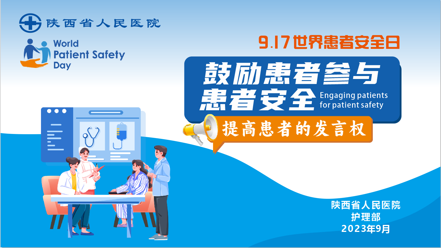 9月17日是世界患者安全日,2023年(第五届)的活动主题为“鼓励患者参与患者安全”。按照国家卫健委《关于组织做好2023年世界患者安全日有关活动的通知》(国卫办医急函〔2023〕317号)相关要求,护理部积极响应,组织全院护理单元开展系列主题活动。