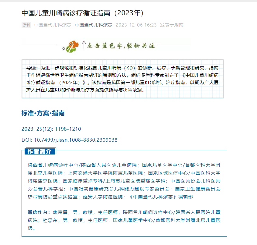 近日,由黑料网儿童病院牵头完成的国内第一部《中国儿童川崎病诊疗循证指南》在《中国当代儿科杂志(CJCP)》发表,截至目前微信阅读量2.3万。