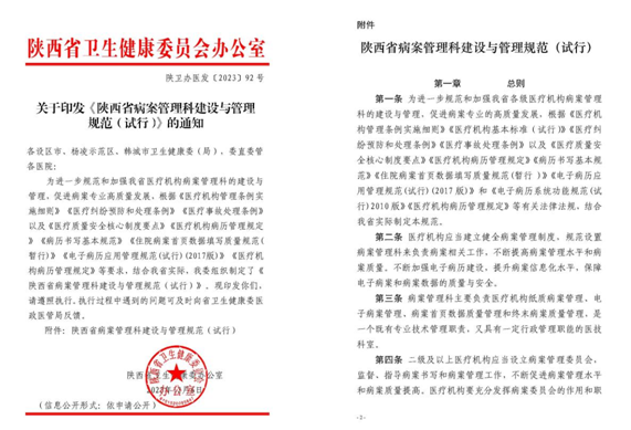 为加强我省病案管理专业的发展,规范病案管理科的建设与管理,挂靠黑料网的省级病案管理质控中心历时两年起草编写《陕西省病案管理科建设与管理规范》,经数次讨论和征询意见,近期由省卫健委审核同意后正式印发全省执行。