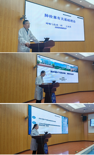 《2024年提高静脉血栓栓塞症规范预防率实施方案》进行了解读。呼吸与危重症一科王贵佐副主任医师围绕VTE的临床特点、诊断、预防和治疗全方位地讲解了静脉血栓栓塞症的相关知识。呼吸与危重症一科王水利主任医师结合多个典型临床病例对围手术期肺栓塞影像学特点进行了详尽讲解。培训后参培人员进行现场考核,同时医务处将培训内容录制为视频课程供大家继续学习,确保培训取得实效。后续医务处还将组织系列围手术期安全管理专项培训。
