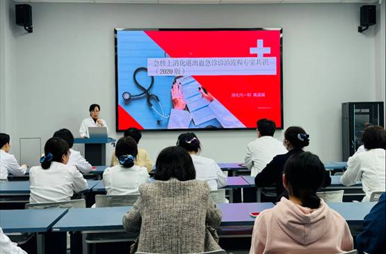 消化内科高淑娟副主任医师分享了《急性上消化道出血急诊诊治流程专家共识》,对上消化道出血救治流程进行了详细的说明,强调了多学科协作,根据科学的量表规范诊疗过程,提高上消化道出血的抢救水平。内分泌科苏亚医生分享了《糖耐量试验及胰岛功能评估结果解读》,她从试验流程,指标分析,胰岛功能评估以及案例几个方面进行了详细解读,以进一步提高医护对糖尿病早发现早诊断的临床意识。