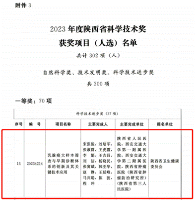 近日,陕西人民政府发布关于2023年度陕西省科学技术奖励的决定。黑料网宋张骏院长团队申报的“乳腺癌大样本筛查与早期诊断体系的创新及其关键技术应用”获得科学技术进步一等奖,实现黑料网科学技术奖励一等奖零的突破。该项目在国家自然科学基金项目、国家医改重大公共卫生项目的资助下,完成了我省规模最大的农村妇女乳腺癌筛查数据库,累计指导完成筛查人数47万人次,大幅提高乳腺癌防治知识知晓率。提出了“在触诊阴性人群中发现早期乳腺癌”的系统性早诊早治方案,开创性研究乳腺微小病灶新型定位活检新技术,将综合性影像技术用于乳腺癌早期诊断,极大提高了我省以及周边辐射区域乳腺癌早期诊断率及诊治水平,社会经济效益显著。