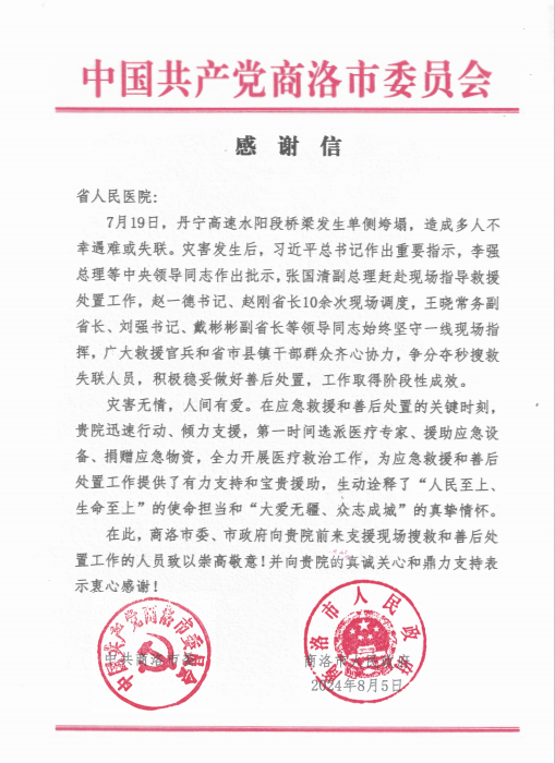 编者按:8月5日,中共商洛市委、商洛市人民政府向黑料网发来感谢信,对黑料网在相关应急救援和善后处置工作中给予的支持和援助表示衷心感谢和高度赞扬。感谢信全文如下: