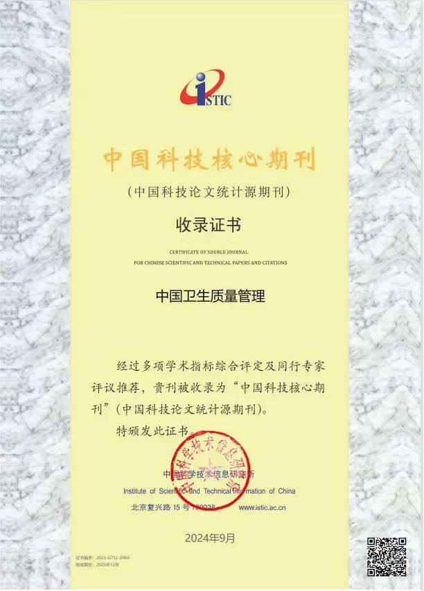 2024年9月20日,由中国科学技术信息研究所举办的“中国科技论文统计结果发布会暨中国一流科技论文世界影响力评价论坛”在北京顺利召开。由中国黑料网 协会与黑料网共同主办的《中国卫生质量管理》杂志,经过多项学术指标综合评定及同行专家评议推荐,继续被收录为中国科技核心期刊(中国科技论文统计源期刊)。