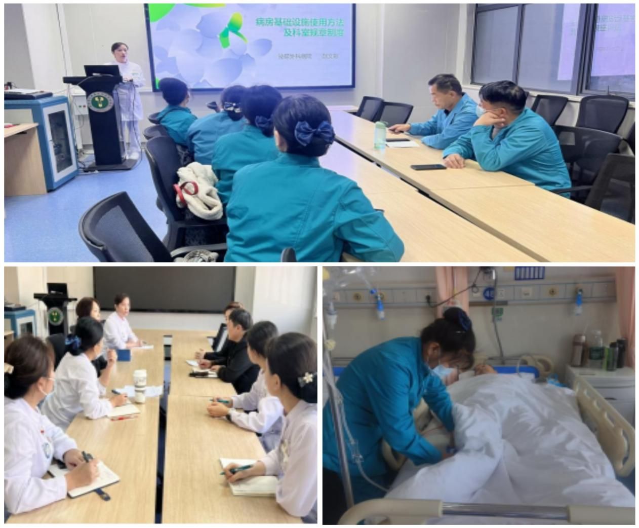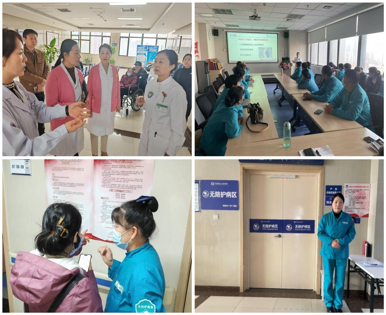 为提升医疗护理员的专业技能和服务水平,使无陪护试点病房有序开展,在前期筹备过程中,各科室护士长与陪护公司负责人员细致沟通人员配置、工作职责、人员分工和管理要求,组织团队成员梳理岗前培训要点并加强培训,培训内容涵盖了生活照护技能、沟通技巧、紧急情况处理、风险评估、专科观察照护、心理支持等多个方面。通过系统的培训,确保护理员能够满足患者的需求,并在医护人员的指导下提供高质量的服务。