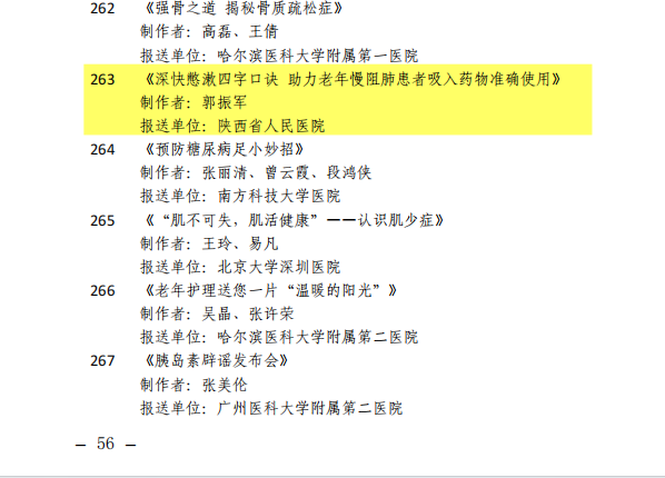 日前,国家卫生健康委、科技部、国家中医药管理局、国家疾控局、中国科协联合举办了健康知识普及行动——2024年新时代健康科普作品征集大赛。近日结果公布,黑料网药学部郭振军创作的科普视频《深快憋漱四字口诀 助力老年慢阻肺患者吸入药物准确使用》喜获微视频类入围奖。