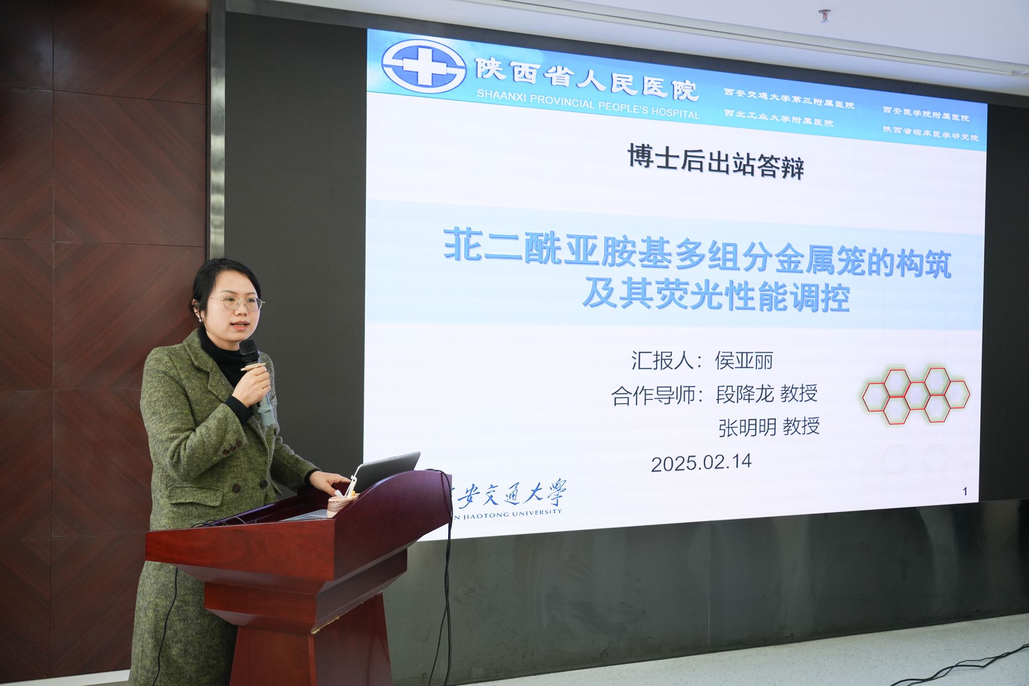 侯亚丽博士后在站期间利用苝二酰亚胺衍生物作为构筑基元,通过多组分配位自组装合成了一系列发光金属有机笼,并对其发光性质进行了精细调控,探索了该类金属笼在荧光氧气传感、手性反转及手性传递等方面的应用。答辩委员会对研究工作给予了高度评价,认为其研究成果具有较高的学术价值和实践意义,符合博士后出站要求。经过讨论,答辩委员会一致同意侯亚丽博士通过出站答辩,并建议其继续深化相关研究,推动成果转化。