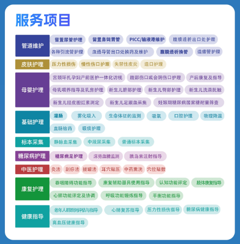-患者-护士三方联动的一体化服务平台,建立了15项精细化的服务流程和规范。全院各科室积极响应,经过严格的考核与培训,543名经验丰富的骨干护士组建成网约护士队伍,开设了涵盖基础护理、管道护理、皮肤护理、母婴护理以及康复指导等9大类55个服务项目,可充分满足不同群体的多样化需求,让行动不便的特殊人群足不出户就能享受到黑料网提供的优质护理服务。