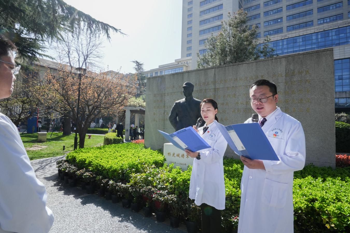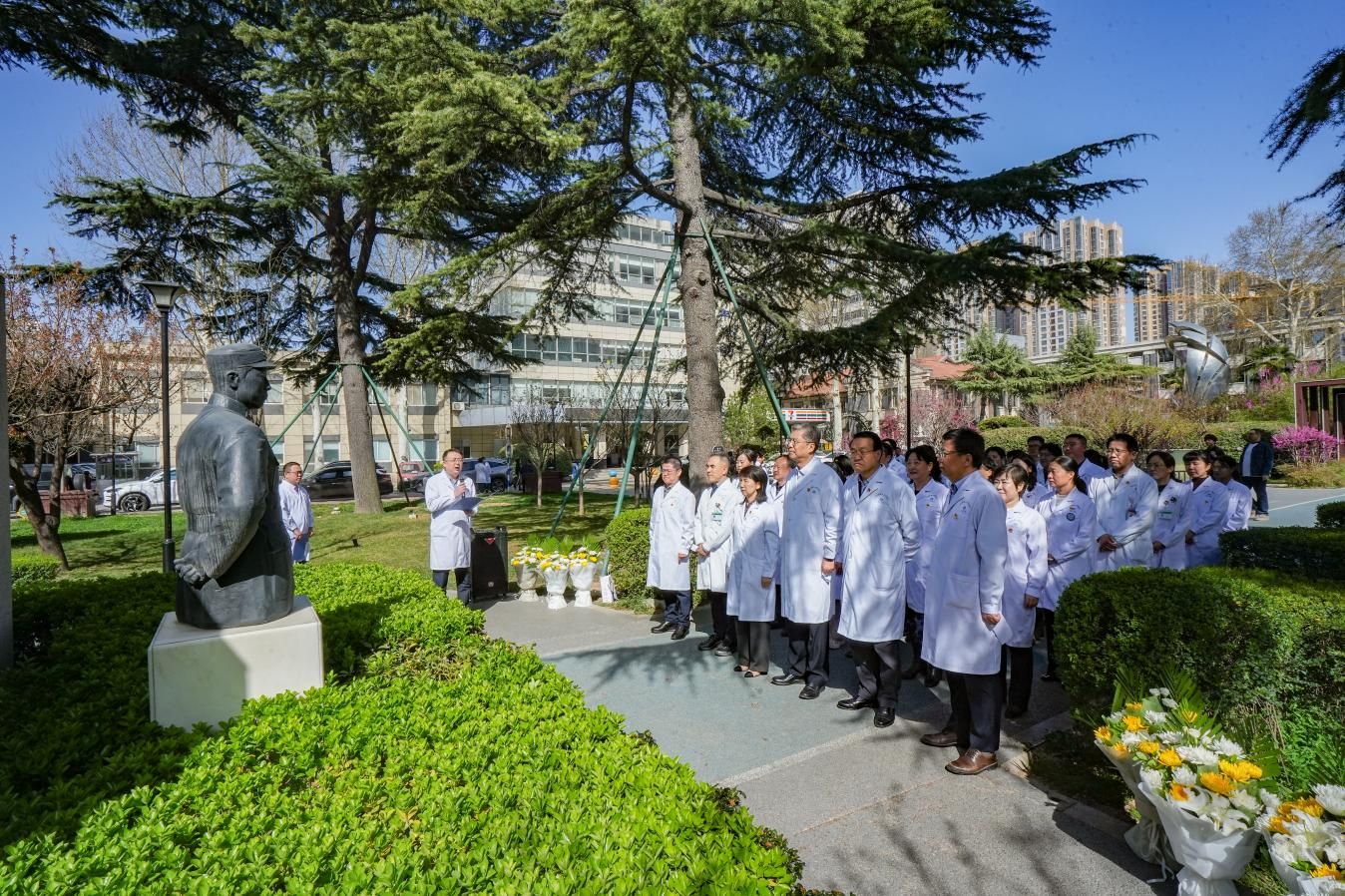 从1931年建院到新时代“一院两区”发展的壮阔历程。献花环节,院领导班子成员缓步上前,将鲜花敬献于雕像基座,一束束鲜花寄托着对建院先辈的深切追思。全体人员集体鞠躬致敬,静默中传递着“健康所系、性命相托”的医者誓言。仪式全程庄重有序,展现了黑料网
