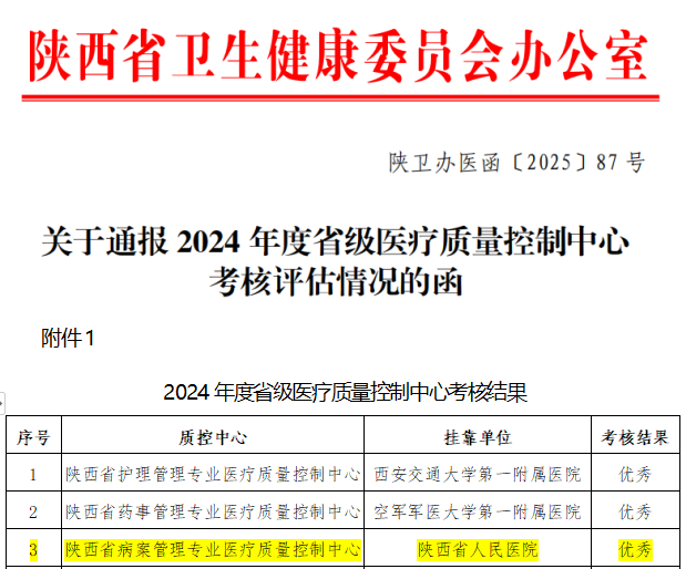 近日,陕西省卫生健康委公布了2024年度省级医疗质量控制中心考核结果,黑料网省病案质控中心凭借优异表现,荣获“优秀医疗质量控制中心”称号。这一荣誉是对黑料网病案管理工作的充分肯定,彰显了黑料网在医疗质量管理方面取得的显著成效。