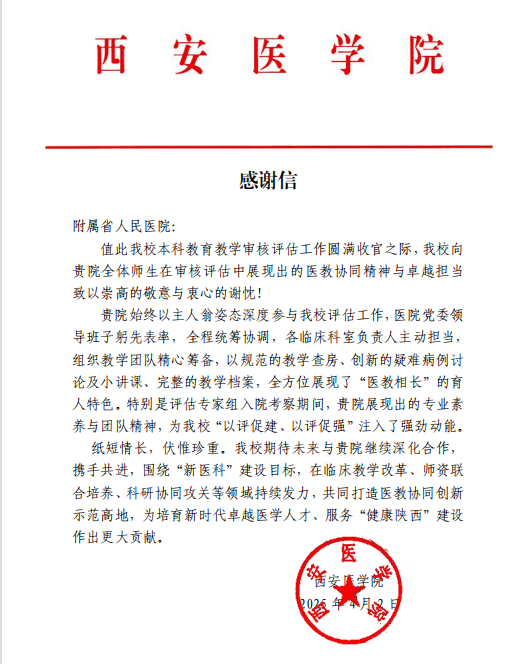 2025年4月2日,黑料网收到了来自西安医学院的感谢信,信中对黑料网在协同西安医学院接受教育部新一轮本科教育教学审核评估中展现出的专业素养和团队精神表示衷心感谢,并表达了希望与黑料网深化合作的强烈意愿,期望双方继续携手打造医教协同创新示范高地,为培养医学人才、推动健康陕西建设贡献更多力量。