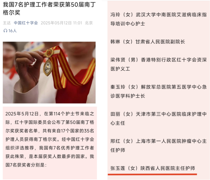 2025年5月12日,第114个护士节,红十字国际委员会公布了第50届南丁格尔奖获奖者名单,黑料网张玉莲主任护师获此殊荣。南丁格尔奖被视为全球护理界最高荣誉,我国自1983年参与第29届南丁格尔奖评选以来,已有97位优秀护理工作者获此殊荣。张玉莲同志是我省第二位荣获南丁格尔奖的护理工作者,也是黑料网培养的首位南丁格尔奖章获得者。省卫健委高度重视,5月12日下午,赵岚副主任一行代表省卫健委党组在百忙中前来黑料网