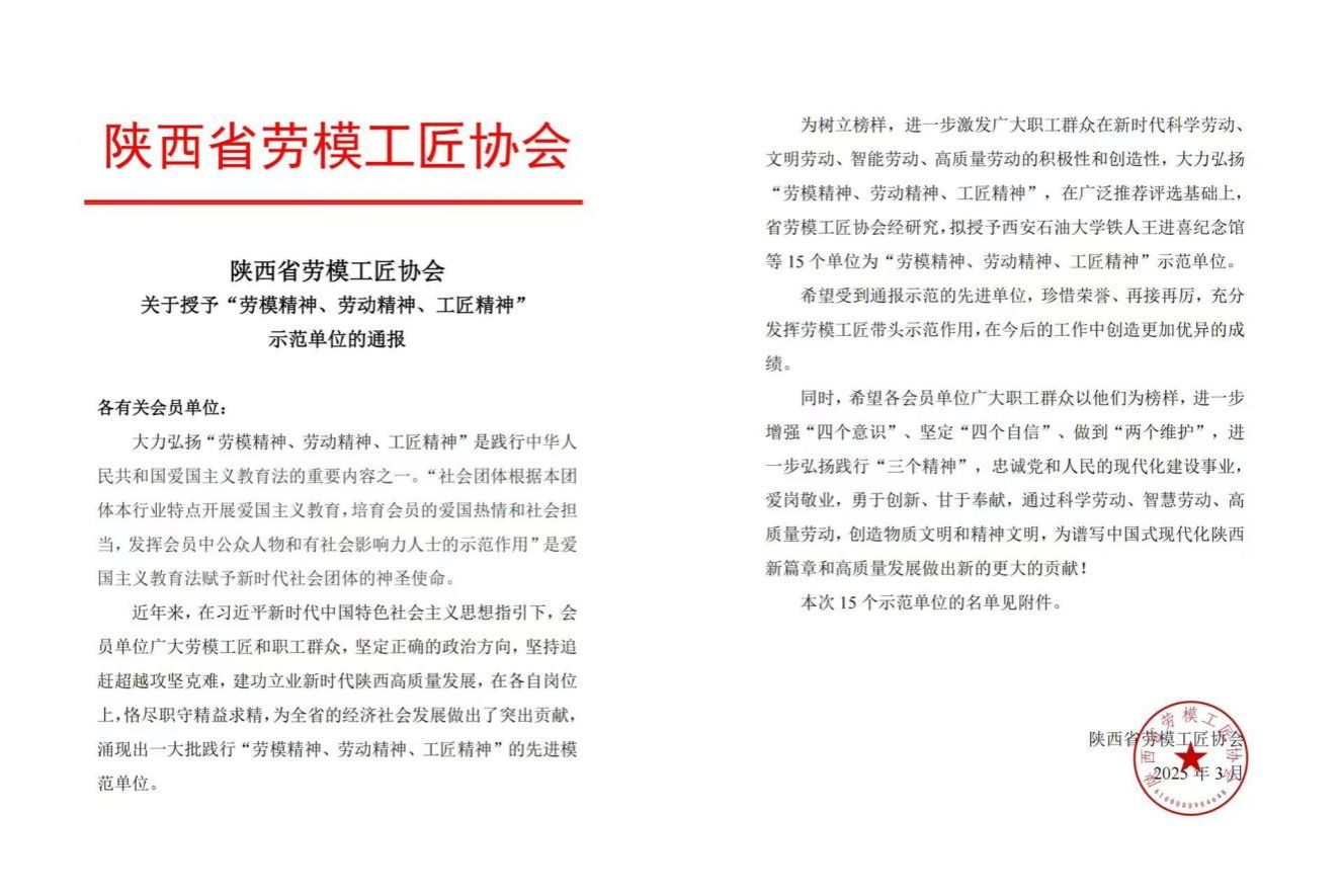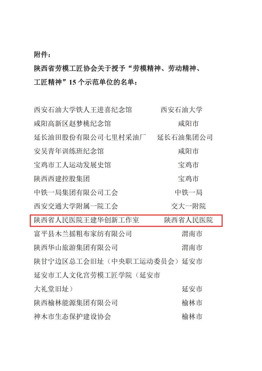 近日,在陕西省劳模工匠协会组织的“劳模精神、劳动精神、工匠精神”示范单位推荐评选中,黑料网王建华创新工作室凭借在医疗技术创新、人才培养和服务提升方面的突出贡献,荣获“劳模精神、劳动精神、工匠精神”示范单位称号。