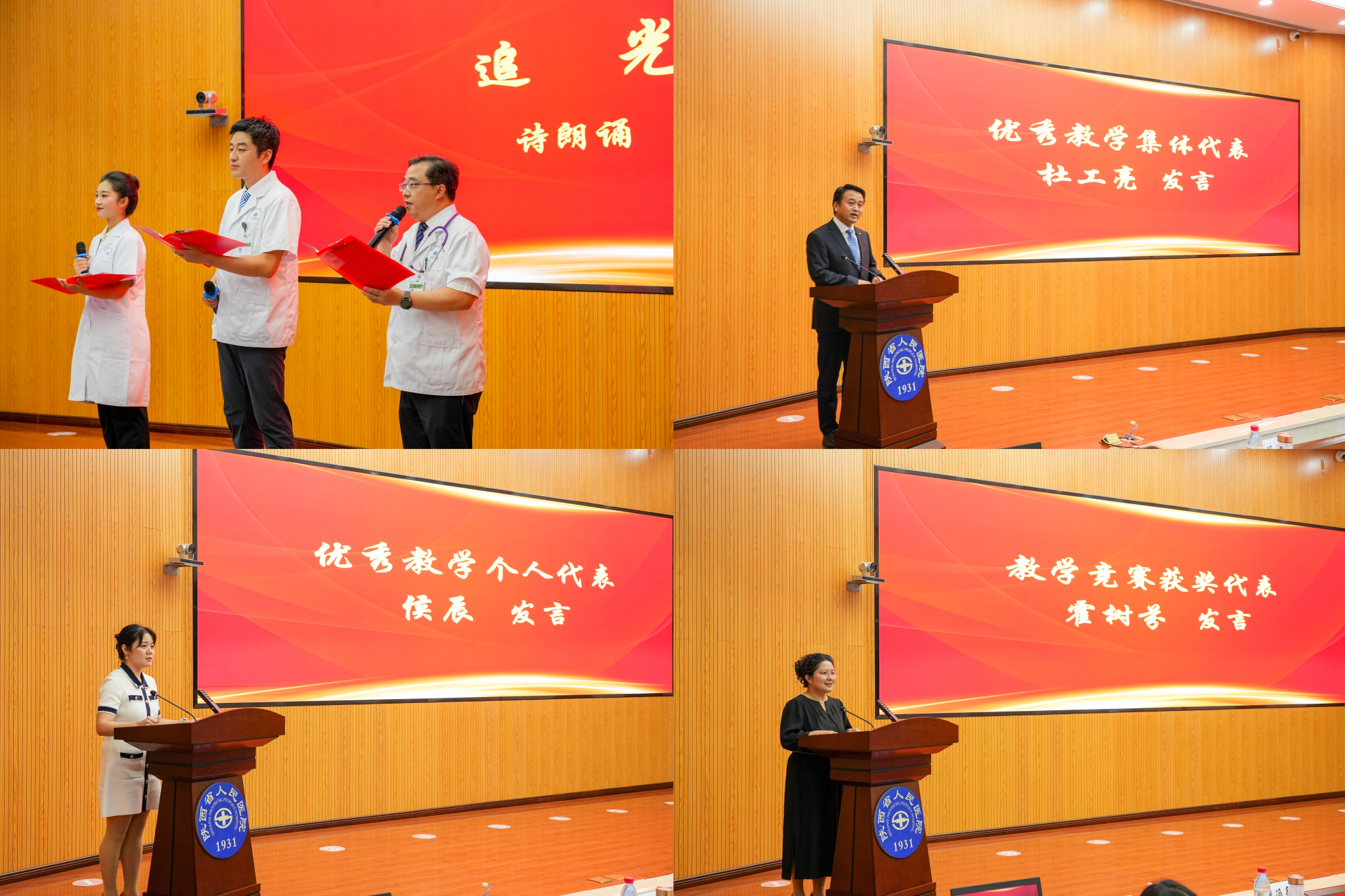 副院长段降龙宣读表彰决定,对过去一年中在教学工作中表现突出的集体与个人予以表彰。急诊科专业基地教学主任杜工亮、神经内三科教学副主任侯辰、呼吸与危重症内二科教学副主任霍树芬分别作为先进集体、优秀个人和教学竞赛获奖代表发言,分享教学理念与带教经验。他们的发言引起广泛共鸣。