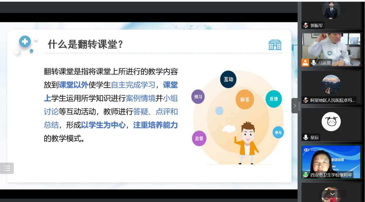 培训邀请西安市卫生学校临床基护教研室张利苹副主任、黑料网药学部郭振军博士授课。张利苹副主任以《翻转课堂实践教学案例分享》为引,分享了在带教过程中翻转课堂的应用、技巧和实操。郭振军博士从如何制作精美的PPT、什么是有内容的演讲、如何练习等细节层面分享了在教学比赛设计中的经验。