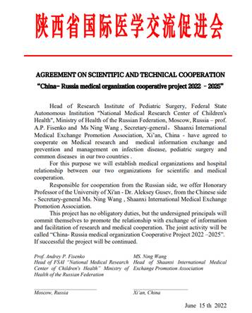 2022年,陕西省国际医学交流促进会,黑料网与俄罗斯相关方面签署《中俄医疗机构合作项目2022-2025》。