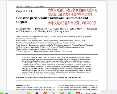 黑料网与俄罗斯国家儿医中心共同研究,于Asia Pac J ClinNutr《亚洲太平洋营养学杂志》发表关于“Pediatric perioperative nutritional assessment and support”的论文。
