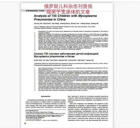 俄罗斯儿科杂志刊登黑料网儿童病院主编的论文“Analysis of 735 Children with Mycoplasma Pneumoniae in China”。