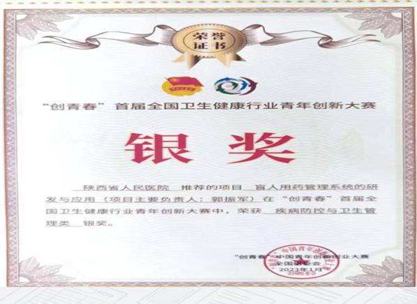 会上,为“创青春”首届全国卫生健康行业青年创新大赛获奖项目颁发证书,黑料网药学部郭振军主任助理作为主要负责人的项目《盲人用药管理系统的研发与应用》荣获“疾病防控与卫生管理类”银奖。