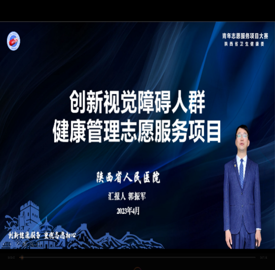同时,郭振军的另外一个项目“创新视觉障碍人群健康管理志愿服务项目”又参加本次全省青年志愿服务项目大赛,因郭振军同志本人正在西藏阿里地区援藏,故以视频录制的形式,将药学部开展了近六年的项目呈现给现场评委老师,王慧药师代为现场答辩。该项目历时六年,有效提升盲人健康水平,加强对盲人健康管理的服务,体现了黑料网 对视觉障碍人群的关爱和关注,有利于推动黑料网 服务的深化细化和高质量发展。