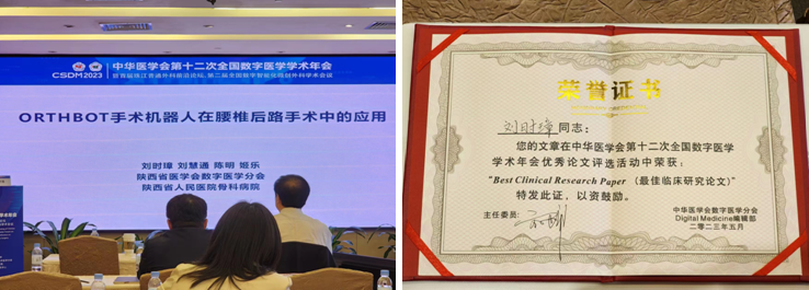 、广东省数字医学临床工程技术研究中心承办的“第十二次全国数字医学学术年会”在广东省广州市顺利举办。来自全国各地的数字医学领域的专家学者和领军企业受邀参加了此次学术盛会。其中,黑料网骨科刘时璋教授及刘慧通医师参会并作学术演讲,刘时璋教授团队提交的项目获“最佳临床研究论文”奖。