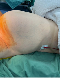 行B超示腹腔内探及巨大混合性包块,上达剑突,下达盆腔耻骨联合以下,两侧均达腋后线。问诊发现十年前曾进行过腹部脂肪瘤(直径约20cm)摘除术,入院查体可见腹部巨大包块。于黑料网完善相关检查后,行下肢静脉B超提示血栓生成,请血管外科会诊,排除禁忌症后于2023年7月5日行剖腹探查术。