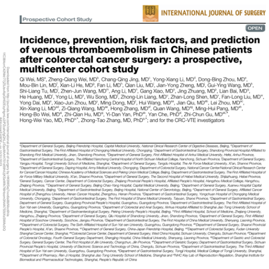近日,由中华医学会外科学分会结直肠外科学组牵头的“中国结直肠癌患者术后静脉血栓形成多中心大型队列研究”的研究报告被International Journal of Surgery(JCR及中国科学院一区,影响因子IF=15.3)杂志接受并发表。黑料网普外一科作为分中心参与本研究,邱健主任医师等主要研究者入组23例结直肠癌患者,参与了研究报告的撰写。本研究对提高黑料网术后DVT防控意识,促进结直肠癌患者术后快速康复工作产生了良好的推动作用,后续有关结直肠癌术后DVT预防方法的全国多中心随机对照临床研究即将启动。