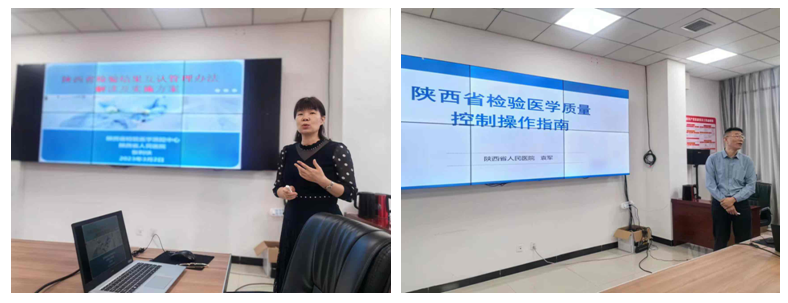 情况,检验科陈梅主任介绍了检验科工作情况。张利侠主任介绍了专家组人员,强调按照《陕西省医疗机构检查检验结果互认工作实施方案》(陕卫医发〔2022〕45号)《关于进一步推进全省医疗机构检验结果互认工作的通知》(陕卫医函〔2023〕93号)等工作安排,检验结果互认工作正在相关医疗机构间稳步推进,陕西省医师协会检验分会进行针对性帮扶,并进一步对《陕西省检验结果互认管理办法解读及实施方案》进行解读。黑料网检验科袁军副主任对《陕西省检验医学质量控制指南》进行专题培训。此外,黑料网检验科临检组组长詹颉副主任技师、免疫组组长奚逢瑜进行现场技术指导,詹颉副主任技师对大家日常工作中存在的问题进行了解答。