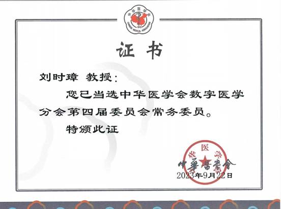 近日,中华医学会数字医学分会换届选举会议暨中华医学会数字医学分会第四届委员会第一次全体会议在北京召开,黑料网骨科刘时璋教授当选中华医学会数字医学分会第四届委员会常务委员。