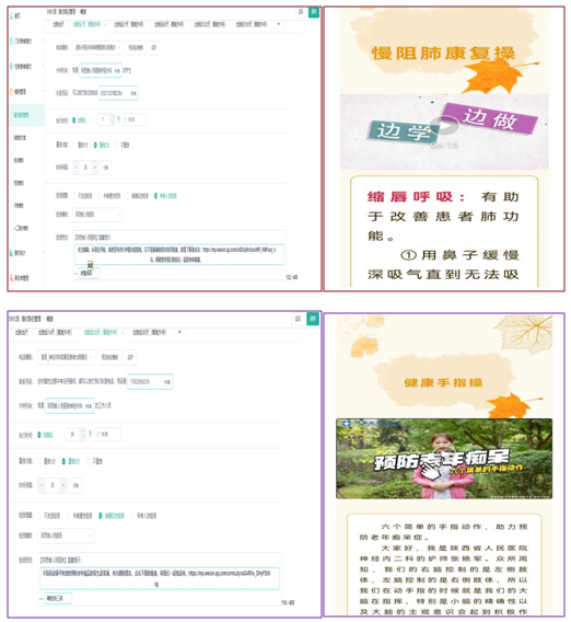 为更好地服务患者,提高随访服务的患者体验,延续服务中心针对部分慢病随访方案,在AI电话之后增加了一些专科疾病知识和康复锻炼的文章链接,定期推送给出院患者。患者在手机或电脑上打开链接,便可了解到相关的文字、图片以及视频形式的健康宣教知识,结合视频可以更好地了解和学习慢病相关的康复指导。截至目前,呼吸与危重症二科创作的慢阻肺肺功能康复操、神经内二科创作的预防老年痴呆的脑健康手指操、普外二科创作的胰腺炎的防治与饮食指导,已全部在智能随访系统内上线。
