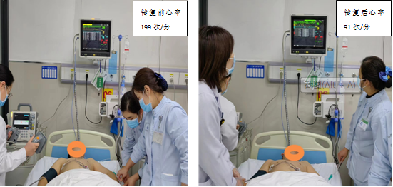 王会强主治医师、张骥主治医师同轮值主任商议后,拟对患者行同步直流电复律,与患者家属充分沟通,消除患者家属对电复律的恐惧心理,征得同意后对患者进行镇静。充分镇静的同时,护士已完成气道管理,备好抢救物品,立即予以50J同步直流电复律一次,心电监护显示心室率立即降至91次/分,复查心电图恢复窦性心律。患者恢复窦性心律后痛苦表情消失,家属协助沟通,问及是否还有心悸不适,患者开心摇头,并向医护竖起了大拇指,家属悬着的心也终于放下,向急诊内科医护表达了诚挚的感谢。严密观察后患者一般情况平稳,安全出院回家。