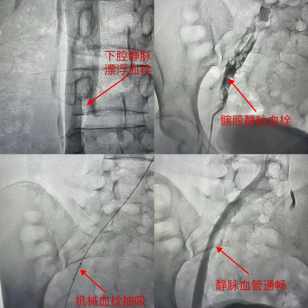 小呼入院时左下肢肿痛明显,大腿较右侧腿粗5cm,疼痛难忍。鉴于患者年龄较小及病情刻不容缓,经充分术前讨论,科室负责人张瑞鹏副主任及王辉副主任、贺仕才博士紧急为患者植入下腔静脉滤器,同时行左下肢静脉血栓抽吸。术中抽吸出大量新鲜静脉血栓,造影发现患者血栓原因为左髂静脉受压迫及股静脉狭窄导致静脉回流受阻。经机械血栓清除+左髂股静脉球囊扩张,再次造影见血流通畅,因患者未成年未植入髂静脉支架。该术式在局麻微创下进行,只有针眼大伤口,术后下肢肿胀等症状迅速得到改善,作用显著,康复出院。