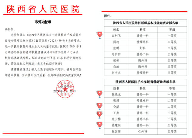 举办外科医师基本技能竞赛及手术/操作视频评比活动,普外一科医师田利飞荣获技能竞赛一等奖,在手术视频/操作评比中,张晓龙荣获一等奖,仝聪荣获二等奖,王奔和姜建同荣获三等奖。