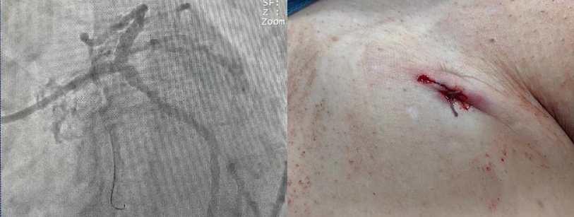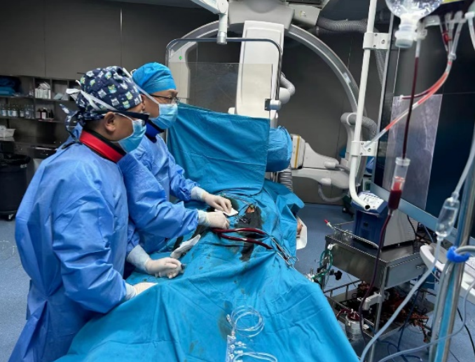 3月7日,西咸院区心内科冠心病介入团队朱舜明副主任医师带领唐治国主治医师、李强强主治医师、张翔住院医师、柳莎莎护士长、崔文宇护师,以及介入导管室团队雷博副护士长、瞿浩主管技师、李炳宇技士,顺利完成物品准备、上机准备、血管评估、穿刺置管等工作,心内科刘博主治医师、梁倩住院医师、刘志远住院医师完成了配血、备血等保障工作,所有医护齐心奋战,整个流程一气呵成,ECMO转机成功。暗红色血液经过膜肺氧合变成鲜红血液,源源不断重返患者体内。术中冠脉造影可见患者左主干末端90%严重狭窄,细小右冠99%狭窄。在ECMO辅助下,心内科介入团队开始进行手术操作。当导丝通过接近闭塞的血管时,患者即出现血流减慢,血压瞬间降至50/30mmHg,透视下心脏几乎不跳动。所有手术人员都捏了一把汗。朱舜明副主任医师迅速指挥抢救,通过提升ECMO转速和流量,并快速用球囊扩张狭窄血管后,患者血流动力学恢复稳定,血压升至110/70mmHg。后续在血管内超声(IVUS)指导下,历时1小时余,完美完成了左主干血运重建。观察患者生命体征平稳后,撤除ECMO并缝合动静脉伤口,体表仅留下不到2cm的痕迹,患者术后胸痛症状明显好转,安返病房,监测生命体征平稳。