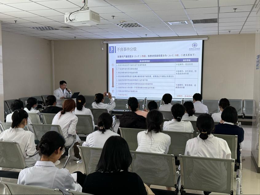 王一波老师从医疗不良事件的定义与分类、报告原则、报告要求和流程、奖励措施以及与超声科相关的不良事件管理等方面做了详尽的讲解。培训后,超声诊断中心医生与李晓晴副处长、王一波老师就具体事件进行了深入讨论交流。