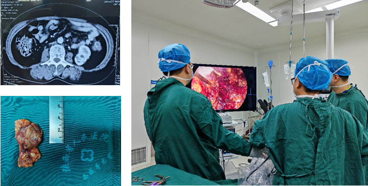 1周前,该患者因胸部不适于外院就诊,行CT提示左肾占位性病变,后慕名前来黑料网西咸院区移植泌尿外科就诊。为了进一步明确诊断,患者住院后随即完善了各项相关检查,结合患者病史、症状、辅助检查分析,经过科室充分讨论,一致认为目前该患者肿瘤位于左肾下极,考虑肾癌可能性大,肿瘤大小约4cm,可行后腹腔镜左肿瘤剜除术。李智斌副主任介绍道,腹腔镜保留肾单位手术已经代替开放手术成为局限性肾癌手术的主要方式之一,通过阻断肾动脉,使肾脏处于缺血状态,并且在半小时内把肿瘤剜除并缝合,最大程度地保留患肾功能,手术微创损伤小,利于患者恢复。在麻醉科、手术室的配合下,李智斌副主任及阮东丽副主任医师、陈波朋医生为患者顺利施行4K腹腔镜下肾肿瘤剜除术,手术顺利,术中阻断20分钟,完整剜除肿瘤并缝合创面,术后患者安返病房。