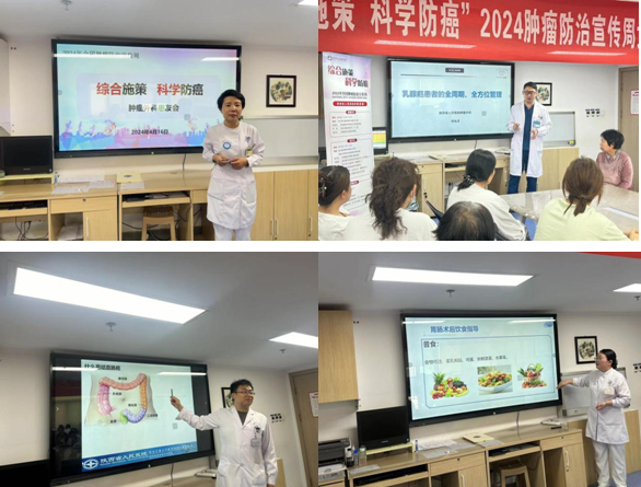 下午,肿瘤外科举办了针对患者及家属的肿瘤防治健康公益讲座。讲座由周蓓副护士长主持,祝旭龙副主任医师、李程副主任医师、杨丹丹主管护师带来《乳腺癌的全周期全方位管理策略》《结直肠癌的诊、治、防》和《肿瘤患者全程营养管理》讲座,分别就患者及家属关心的问题进行讲述,让听众了解了乳腺癌的完整治疗过程、结直肠肿瘤患者常规诊断与治疗方法、常见消化道肿瘤预防方法及肿瘤患者的营养状态。各位专家还现场指导患者如何实现个体化、多元化营养,建议患者家属关注患者在肿瘤治疗过程中的营养状态,普及健康知识。