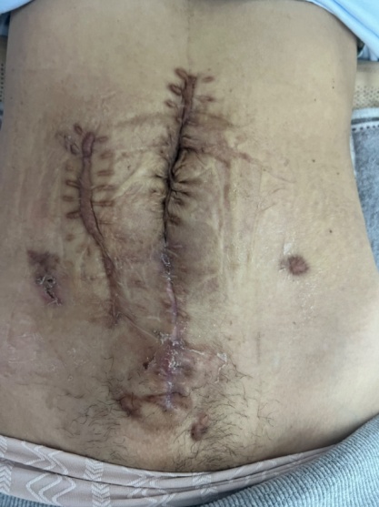 患者为33岁年轻女性,此前因孕期急性肠梗阻行剖宫产+小肠部分切除术、回肠单腔造口术及回肠造口还纳术。后期术区有明显瘢痕增生,并反复出现瘢痕破溃,多家黑料网