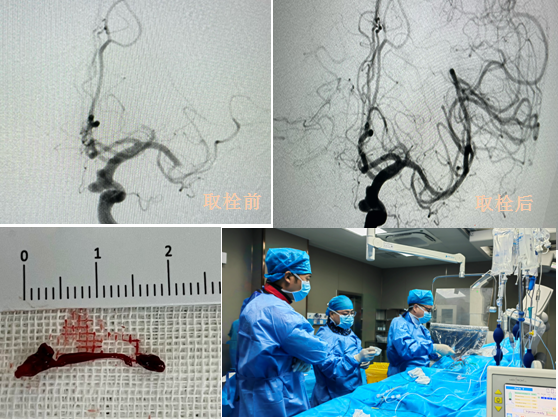 该患者系老年女性,1周前行全脑血管造影术证实左侧颈内动脉颅内段未破裂动脉瘤。急诊医学中心胡炜主任团队充分评估后行气管插管全麻下经导管颅内动脉瘤支架辅助栓塞术。术中放置微导管到位后造影发现左侧大脑中动脉M2段上干闭塞,考虑急性栓塞。立即与神经内科郭生龙主任取得联系,郭生龙主任带领神经介入团队到场后进一步评估,情况紧急,必须刻不容缓地采取介入治疗手段,以确保闭塞的血管得到及时疏通,从而最大程度地挽救患者的脑组织。向患者家属充分告知手术风险,取得家属知情同意后立即实施脑动脉栓塞取栓术,术中利用ACE068导管抽吸取栓,前后用时仅15分钟,再通后观察30分钟造影所见左侧大脑中动脉前向血流通畅,TICI 3级。随后胡炜主任团队行经导管颅内动脉瘤支架辅助栓塞术后,患者安返病房进行进一步治疗。