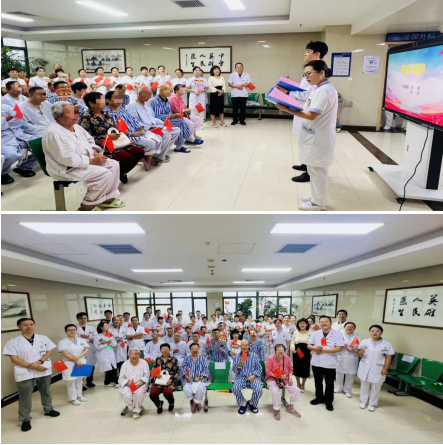 高质量发展贡献力量。活动中,支部书记孙羿带领全体党员同志重温入党誓词,铿锵有力的誓言表达了全体党员为共产主义事业奋斗终身的坚定信念。随后,医护人员和住院患者积极参与红歌竞猜活动,现场气氛活跃,欢声笑语不断。猜对红歌的参与者获得了精心准备的小奖品——可爱的多肉植物,这份小小的惊喜,更增添了节日的喜庆气氛。活动还穿插了精彩的诗歌朗诵,林静和张琪两位护士以饱满的热情和真挚的情感,深情朗诵了以祖国为主题的诗歌,表达了对祖国的热爱和祝福,赢得了阵阵掌声。